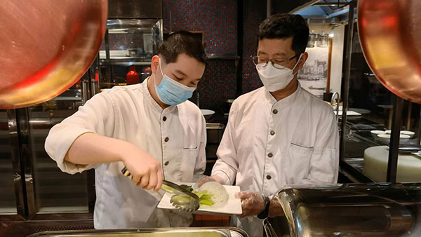 Facing the shortage of hands, a temporary mobile team, spontaneously constituted by Party members, League members and young backbone of logistics departments, including Cai Jun from the Engineering Department, Fu Jiayun and Xu Chengyang from the Human Resources Department, Song Ye from the Finance Department and Yan Qingjin from the Reservation Department, joined the support to the Catering Department. At the very moment, they turned chefs, attendants and cashiers responsible for diner reception and guidance, meal distribution, cashiering and bill signing, to greatly ease the pressure of the Catering Department working around the clock.