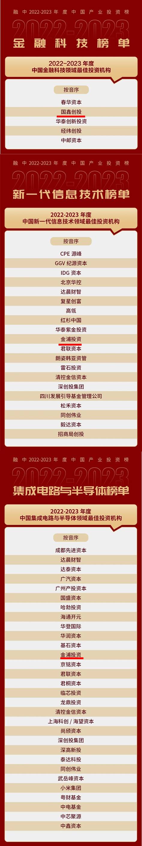 集團(tuán)旗下國(guó)鑫創(chuàng)投獲評(píng)2022-2023年度“中國(guó)金融科技領(lǐng)域最佳投資機(jī)構(gòu)”,金浦投資獲評(píng)“中國(guó)新一代信息技術(shù)領(lǐng)域最佳投資機(jī)構(gòu)”“中國(guó)集成電路與半導(dǎo)體領(lǐng)域最佳投資機(jī)構(gòu)”,上海科創(chuàng)基金、國(guó)方創(chuàng)新獲評(píng)“中國(guó)最佳市場(chǎng)化母基金TOP20”“中國(guó)最佳國(guó)資市場(chǎng)化母基金TOP20”,上海科創(chuàng)基金楊斌獲評(píng)“中國(guó)有限合伙人最佳投資人物”。
