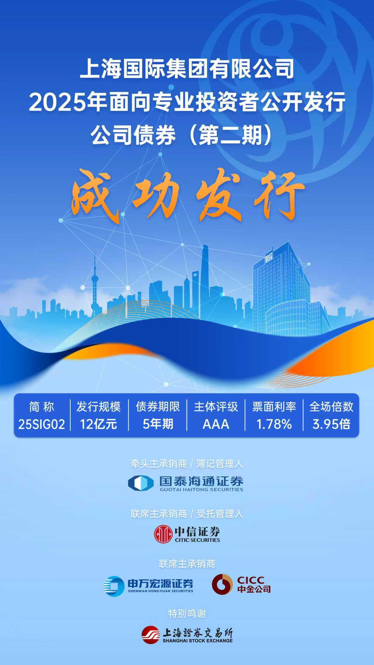 2025年8月21日,集團(tuán)本部成功簿記發(fā)行12億元公司債券,期限5年,認(rèn)購倍數(shù)3.95倍,票面利率1.78%。本期公司債的成功發(fā)行旨在全力服務(wù)上海國(guó)際科創(chuàng)中心建設(shè),壯大新質(zhì)生產(chǎn)力。